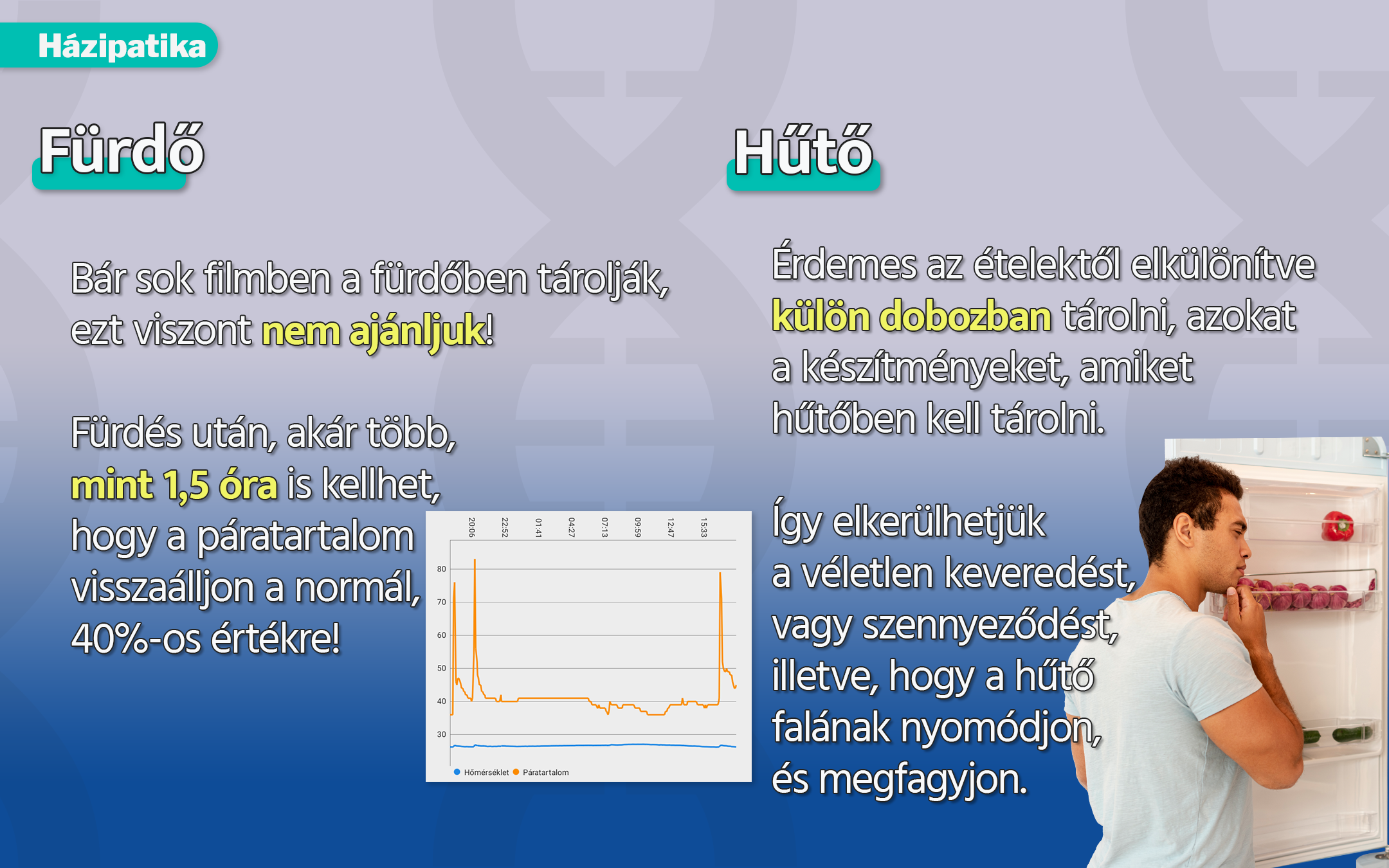 „A fürdőben jó helyen van a szekrényben, sok filmben is ott tárolják.” Ez sem igaz: saját mérésünk alapján, egy két fős háztartásban fürdés során akár 80% fölé is mehet a relatív páratartalom. Akár több, mint 1-1,5 óra is kell fürdés után, amíg visszaáll a normális, 40% körüli értékre. Ez persze nem tűnik soknak, de ha minden nap, hosszú ideig ekkora páratartalom-ingadozásnak tesszük ki a gyógyszert, az előidézhet nem várt károsodást.