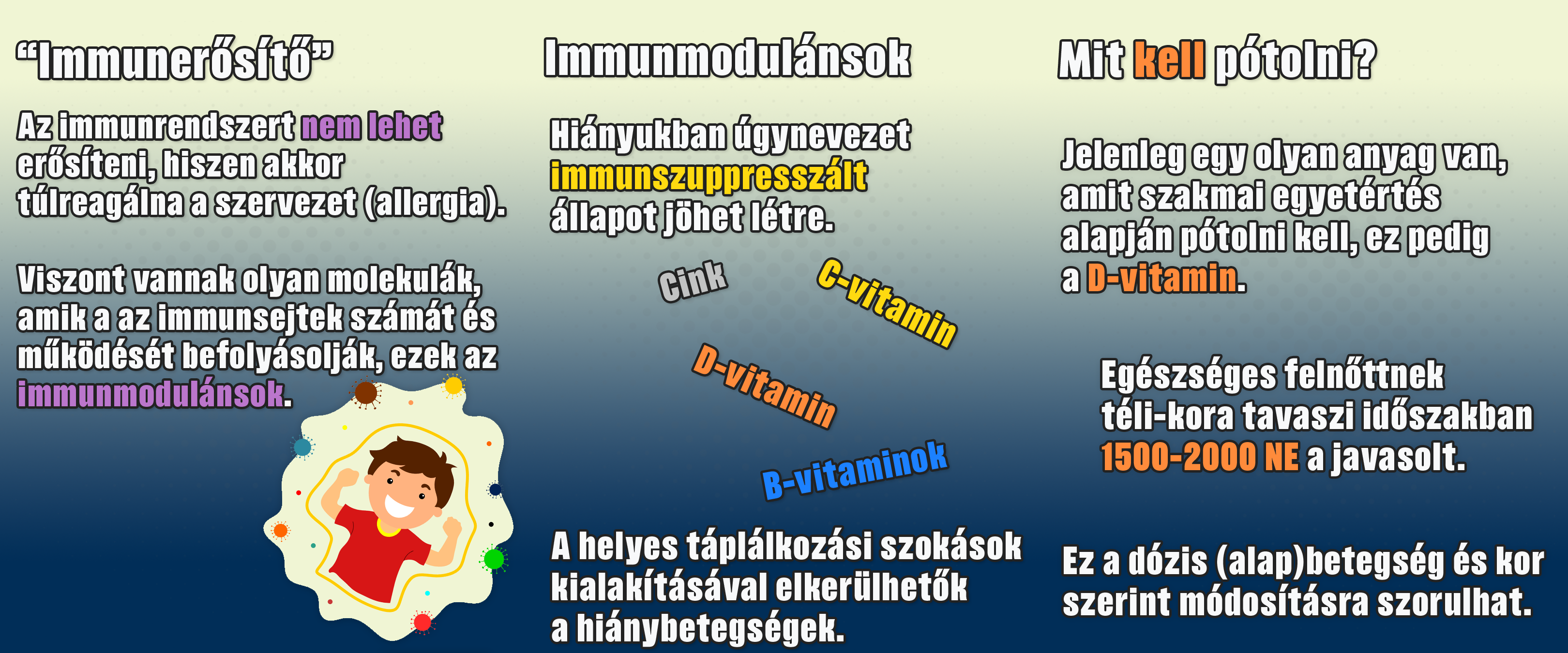 Magyarországon a téli időszakban viszonylag kevés a napos órák száma, illetve keveset tartózkodunk napon. Ezért könnyen kialakulhat D-vitamin-hiány, ami vezethet az immunrendszer legyengüléséhez. Napi 1000-2000 NE szedésével ez a probléma kiküszöbölhető. (6) A legtöbb esetben ezen kívül más vitaminból és ásványi anyagból nem szenvedünk hiányt.